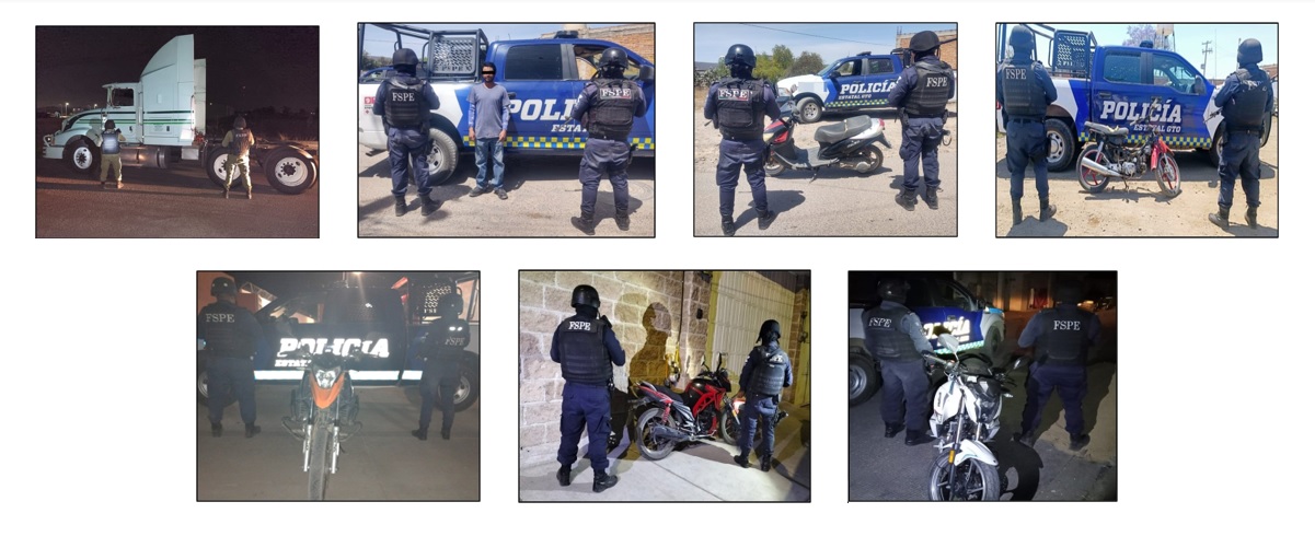 Guanajuato, Gto.- Derivado de labores de patrullaje, elementos de las Fuerzas de Seguridad Pública del Estado (FSPE), lograron el aseguramiento de un tracto camión y cinco motocicletas. Todas las unidades presentaban reporte de robo al momento de su localización.