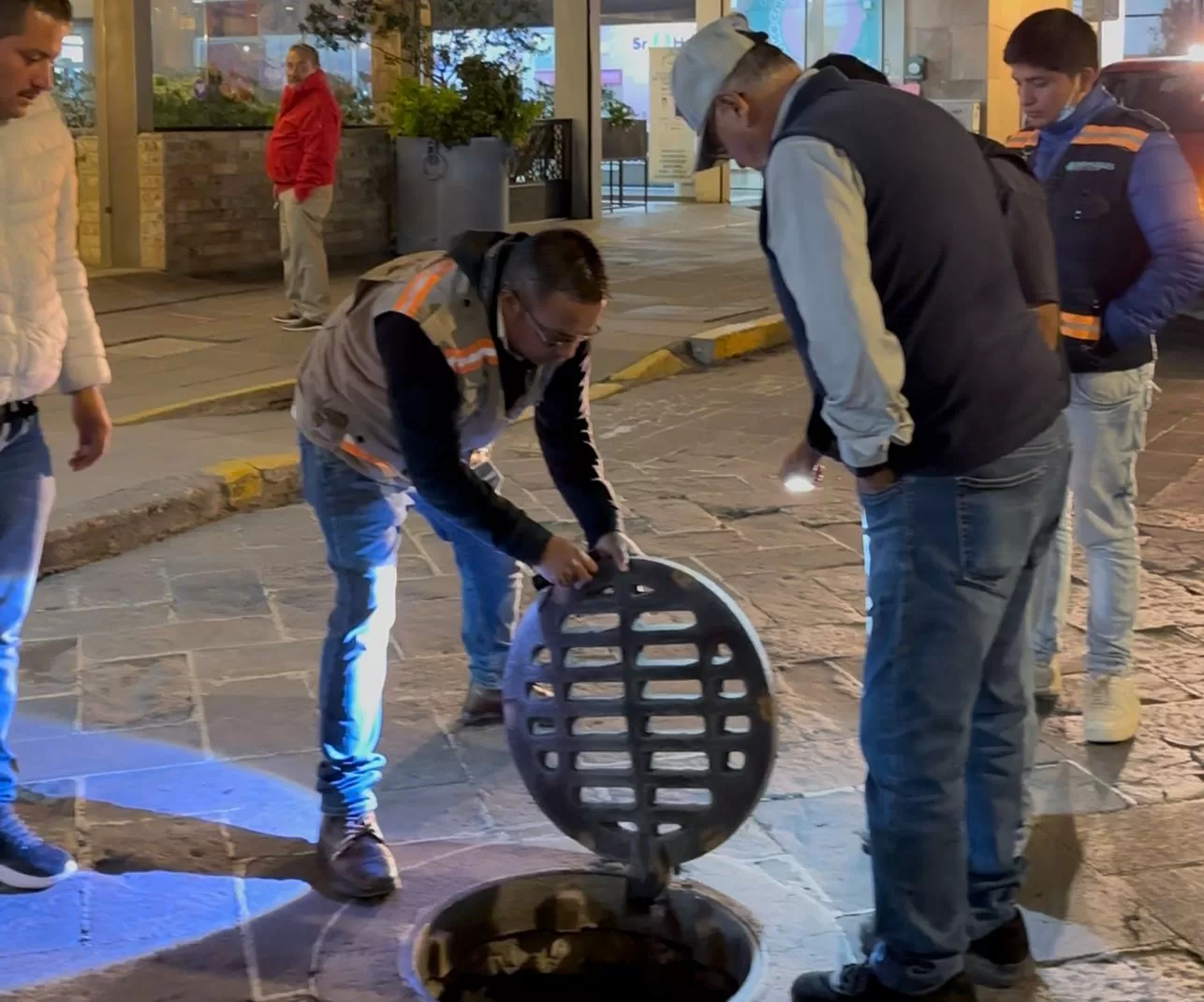 San Luis Potosí, SLP.- A petición de reportes vecinales sobre una posible fuga de gran magnitud, INTERAPAS llevó a cabo una revisión nocturna en el primer cuadro del Centro Histórico de la ciudad capital.